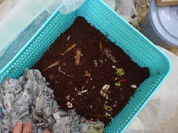 (最上層の新聞紙が乾燥していると,ミミズはエサに気づかず,多湿な底の方に潜ってしまうとか)